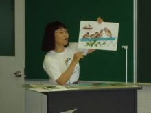 1時間位バードウオッチングをした後、室内に移って雨天時のプログラム「野鳥はともだち」を猪崎先生の講演兼司会で、約1時間30分にわたり実施しました。