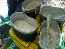 ![]() 飯盒のご飯をよそってやっと昼食です |