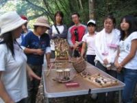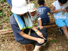 子どもたちへの環境教育の一環として、また成人には環境への啓発の場として、自然環境を遊びながら学んでもらうために、ディキャンプを実施しました。ネイチャーゲームでは、自然をさまざまな感覚や心を通じて理解し、自然と自分が一体であることを学びます。飯盒での炊飯、釜戸でのソーセージ焼き、森の工作やバームクーヘンを作る等、自然の中で非日常的な体験をします。