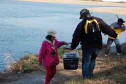 海の近くまで野鳥探しが進み探鳥は終了しました。その後、皆で河川のゴミ拾いをしながら、野鳥の話のため室内に移動しました。ゴミは、(特に釣り道具の放置)野鳥の大敵です。