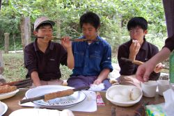 今年は、門川高校からボランティアスタッフとして3人の高校生が参加してくれます。デイキャンプを実施する門川高校演習林研修棟で、デイキャンプのプログラム確認をしました。釜戸の準備と昼食の炙り焼きソーセージと飯盒炊飯の事前予行調理、ツイストパン焼きを実際にやってみて当日の役割分担等を整理しました。