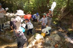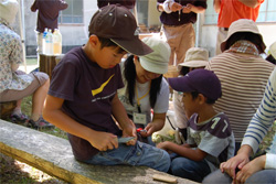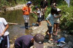 炙り焼きソーセージでお昼ご飯が済んだら、高校生と子どもたちだけで川遊びに出かけました。川に、炙り焼きソーセージを餌にしてペットボトルで作った魚取仕掛を川に沈めて、小さな魚を捕りました。川の中で、子どもたちがおおはしゃぎしたので、あまり魚が仕掛けに入ってくれませんでした。