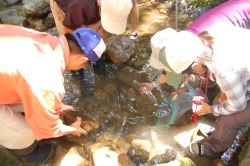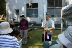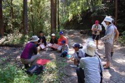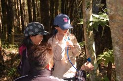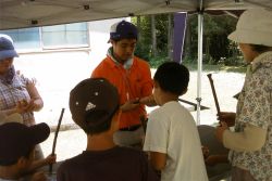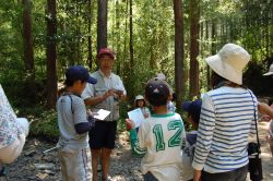 今年のデイキャンプは、門川高校の協力で門川高校演習林研修棟周辺での実施とボランティアスタッフとして3人の高校生と先生1人が参加してくれました。子どもたちへの環境教育の一環として、また成人には環境への啓発の場として、自然環境の中で遊びながら環境についてを学んびました。
