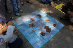 | 2.ネイチャーゲーム 《ジャンケン落ち葉集め》 葉っぱにはいろいろな形、大きさがあり、種類ごとに違っています。“種類”の違いに着目する活動に特化させるため誰でもできるジャンケンをし、ジャンケンに勝ったら1枚ずつ葉っぱを拾いながら、葉っぱの違いに気づく楽しい活動です。 最後に、全員の落ち葉を種類事に並べて、何種類あったかを数えます。 |