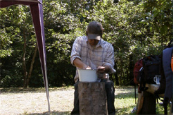 | 《音いくつ》 音を集中的に聞くという時間をとると、、だんだんと感覚がとぎすまされてきて、小さな音まで聞こえるようになってきます。また、同じ風の音でも遠くでうなっている音と真上で葉をゆらす音の違いなどにも気づかされます。今日は、たくさんの鳥の鳴き声が聞えました。カケス、ウグイス、オナガ、メジロ、シジュウカラ等。 |