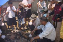 高校生ボランティアによる炙り焼きソーセージ生地のカシ棒への巻き方の説明があり、小さな参加者も炙り焼きソーセージを作りました。その後、みんなで釜戸の直火で焼き上げました。焼きあがったソーセージをおかずに、おにぎりをほおばりました。