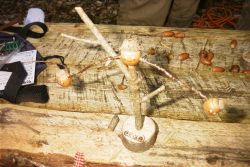 子どもたちが川から帰ってきたら、ツイストパン焼きをしました。子どもたちがパン生地をカシ棒に巻きつけて、釜戸でゆっくりと焼き上げます。焼き上げたツイストパンを食べ終わったら、工作作りをはじめました。