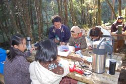 事務局で用意した野外活動定番の豚汁と参加者が各自持参したおにぎりで昼食をとりました。環境を考えて竹のおわんを作り、また、参加者にてマイ箸を持参していただきました。