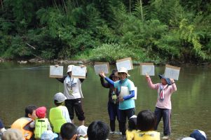 宝物探しは、カードに書かれた物(例えばキラキラしている物)を川の中で探し、川の生き物調べにつなげて行きます。手長エビやオイカワ等を手網で獲って、最後に探した宝物の名前を覚えます。