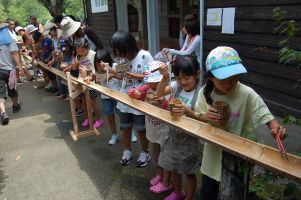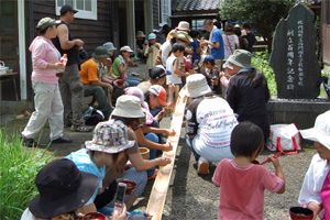 12時30分になったら森の学舎に戻り素麺流しで昼食となり、参加者がそれぞれ竹で作ったお椀で素麺流しを楽しみました。素麺流し初体験の子供たちは、とても喜びはしゃぎまわりながら素麺を美味しそうに食べていました。川での活動で、きっとお腹がペコペコだったことでしょう。