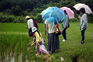 会員と特別参加者は、梅雨終わりの雨の中で増水して冷たかった五十鈴川で、箱めがねで魚を観察し、魚を釣ったり、網でエビを獲ったりしました。思ったより多くの川の生き物を見ることができ、魚やエビを獲ることができました。午後は、雨があがり暑い日差しの中、森の学舎周辺の田んぼを廻って貴重な植物を観察しました。その後、「川をたのしく親しもう」のスタッフとして参加する会員で、釣ったり獲ったりした水の中の生き物について調べまとめました。