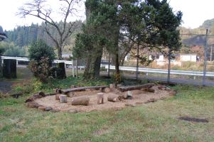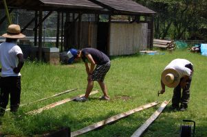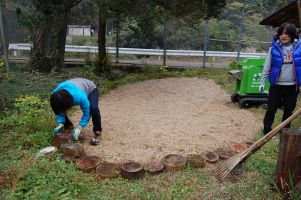 | 明日の環境学習のスタッフ | 木材と竹のチップのベンチスペースはふかふかです。 |