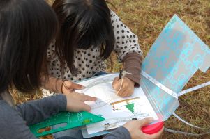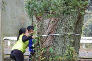 | 木の天辺が見えた位置から木までの距離を測り、その後幹周りを測ります。そして、二酸化炭素の吸収量を計算します。 | |