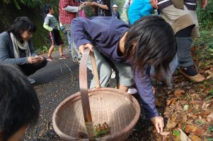 明日に開催する環境学習に備えて、ドングリ・ポットとあぶり焼きソーセージの準備を行いました。事前準備であることから、今日の参加者は環境学習のスタッフ5人です。夕方薄暗くなるまで、森の学舎の整備も一緒に実施しました。明日は、MRT環境大賞の番組製作のためにMRTよりTV撮影が入ります。