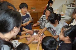 ![]() あぶり焼きソーセージの生地作りは子供たちに大人気。 |