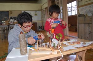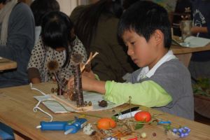 散策で集めた素材と、森の学舎に用意してある工作素材を使って、参加者オリジナルの作品を作っていきます。参加した子供たちにとって一番楽しんだ時間だったようです。