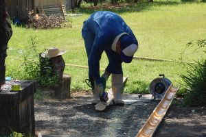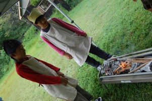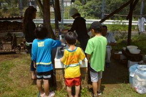 子どもたちに、ソーセージ生地づくり・釜戸ご飯炊き・あぶり焼きの3班に分かれてもらい昼食の準備を始めました。