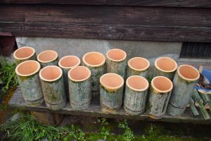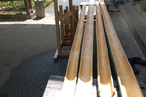 | 竹を二割にして節を落とし素麺の流しレールを4本作り、合わせると15mのレールとなります。 | |