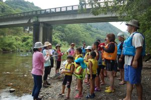 オリエンテーションで、今回の目的と子どもの森スタッフと宮崎ネイチャーゲームの会の紹介、そして記念撮影後に、川でのネイチャーゲームを五十鈴川で行ないました。また、川の生き物の大切さ、きれいな水には森林が必要であること等の話もありましたが、小さい子供たちには、ちょっと難しかったなぁと思います。