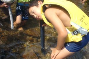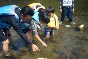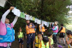 ・川辺でのパズルゲームや生き物探し、笹舟作り、川の音を聞いてみるなど、普段体験できないもの、懐かしく感じるものと、もりだくさんで子供と一緒に楽しく過ごしました。皆で作った昼食も、そうめん流しに揚げたての天ぷら、お腹一杯に美味しくいただき大満足です。きれいな川の上にはそれを作る森がある。このきれいな川の水を海まで届けられるように、アクリルたわしを使ったり、とぎ汁をそのまま流さないようにするなど、できることからエコ活動に取り組みたい思います。今日はとても気持ちのよい一日でした。親子ともども夏の素敵な思い出ができました。