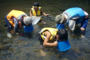 C生き物探し:川に住んでいる身近な生き物を見つけ名前を覚えます。最後に生き物は川に返します。