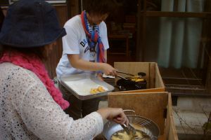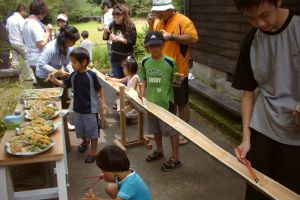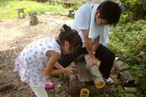 川遊びが終ったら着替えをして、参加者全員で昼食のそうめん流しの準備をしました。釜戸でそうめんを湯で、竹のお椀を作り、野菜を天ぷらにしました。