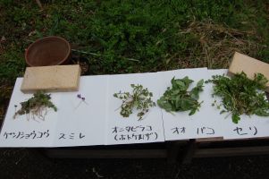 森の学舎周辺の田んぼや土手で野草・山菜の本を持って、食べることができる野草・山菜を約1時間をかけて探しました。収穫したのは、「タケノコ、タネツケグサ、スイバ、ヤブカンゾウ、ミツバ、ツクシ、フキノトウ、ヨモギ、カラスノエンドウ、ヨメナ、レンゲ、ノビル、ゲンノショウコウ、スミレ、オニタビラコ、オオバコ、セリ、アザミ」の18類です。