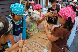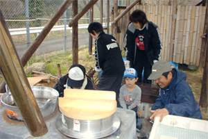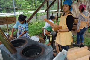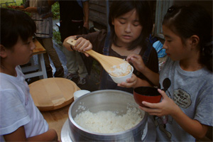 豚肉ミンチと季節の野菜を塩コショウを皆でコネコネして生地を作り、竹串に巻きつけ炭火で、あぶり焼きソーセージを焼き上げました。また、ご飯は釜戸で炊きました。参加者は、それぞれの好みに分かれて全員で昼食づくりをしました。