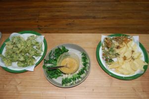 スイバとノビルは和え物に、ヤブカンゾウは酢味噌で、オノタビラコとセリとミツバは雑炊に、タケノコは焼きに、残りは天ぷらにしてお昼のおかずにしました。