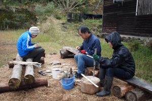 野草・山菜料理での昼食が終わったら、シイタケほだ木を作りました。コナラの木にシイタケ用ドリルでコマ穴を開けて、木槌でシイタケ菌の付いたコマを打ち込んでいきました。参加者全員で約1年6ヵ月後のシイタケ収穫を約束しました。