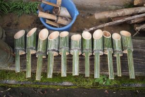 竹のポットに、ボラ土と腐葉土を入れて、ナラカシワ・マテバシイ・イチイガシのドングリを植えました。ドングリは、参加者が自宅で苗木に育て、3年後に山へ戻すことになっています。