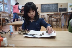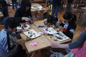 昼食に予定より時間をとったため、工作材料を集めるための散策を取りやめて工作に入りました。森の学舎に用意してある工作素材を使って、オリジナル作品を作りました。