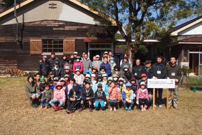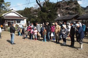 子どもの森の活動としては、過去最高の50人を超える参加者がありました。心配していたお天気も晴れとなり「植樹&春をたのしもう」が開催できました。森の学舎内での開会を考えていましたが、暖かい日差しであったため急遽グランドでの開会となりました。 |