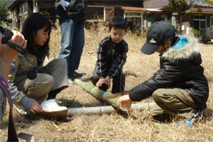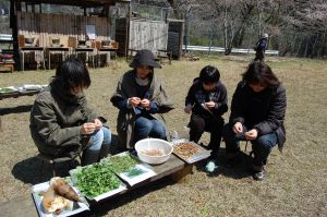 | 12:15 | 昼食準備(山菜料理、かまど炊飯、竹お椀作り) | |