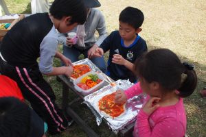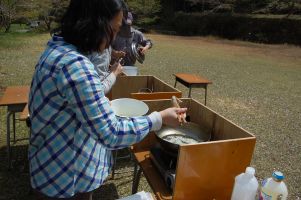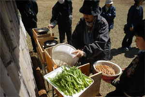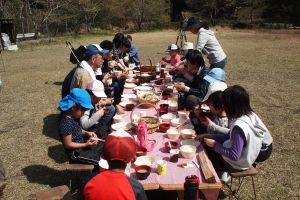 できあがった山菜料理は、春の日光を体いっぱい浴びながらグランドで食べました。予想していた通り調理に時間がかかり予定遅れ昼食となりましたが、その分お腹も減って参加者皆さんは、美味しく山菜料理を食べることができました。