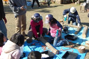 閉会後に、希望者だけ残ってもらいシイタケ種駒打ち体験をしました。コマ打ちの仕方を説明してから、参加者でドリルを使ってコナラ原木にコマ用穴を開け、シイタケ種駒を木槌で打ち込んでシイタケ原木を作っていきます。今回のシイタケ原木には、再来年の秋にシイタケが発生します。