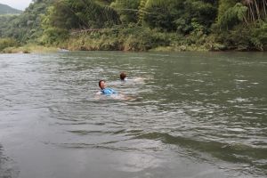 ・川の水が冷たくて、とても気持ち良かったです。いつもと比べて、すごくお腹がすいて、そうめんをたくさん食べました。自然がいっぱいのところで楽しかったです。
