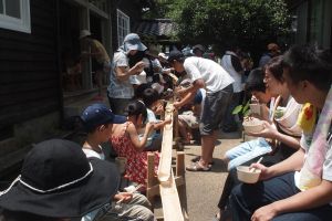 川遊びが終ったら着替えをして、竹のお椀を作り(希望者のみ)を、そうめん流しで昼食をとりました。釜戸でそうめんを湯で、野菜の天ぷらもありました。