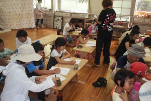 一人、一種類のドングリを3個竹ポットに蒔きました。最初のドングリクイズをして、ドングリは横にして土に埋めることを覚えてもらい、一人一個の竹ポットにボラ土、腐葉土と順番に入れ、ドングリを3個置き、土を1センチほど被せて完成です。ポットには蒔いたドングリの木の名前をマジックで書いてもらいました。