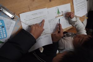 オリエンテーションの後、参加家族単位で、樹木測定器・巻尺・ワークシートを持ってグランドへ。学舎にある高木(3m以上)4本の高さと幹回りを測りました。測った木は、イヌマキ・センダン・サクラ・ヤマモモの4本です。4本すべて測ったら、教室に戻り、4本の二酸化炭素吸収量を計算しました。計算はお父さん・お母さんにまかせっきりのちびっ子もおりました。計算は小学校低学年には難しいですよね。