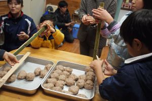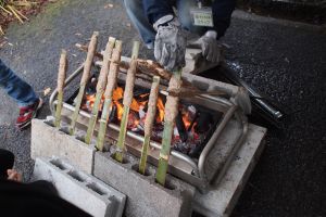 ソーセージ生地を作り竹串に付けていきます。焼いた時に竹串から剥がれ落ちない様に空気を抜きながらしっかりと付けます。そして、炭火で炙って焼きます。参加者全員で作った炙り焼きソーセージがお昼のおかずです。もちろん、ご飯は釜戸で炊きました。