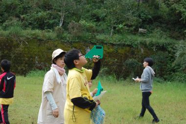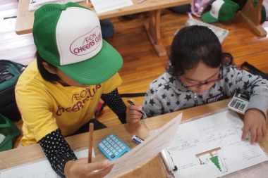 まず屋内で樹木の高さを調べるための樹高測定器の使い方と樹木の幹回りの測り方の説明をおこなって、学舎グランドに出て、イヌマキ・センダン・サクラ・ヤマグワの4種類の樹木の高さと幹回りを家族単位で調べました。その後、屋内に戻ってきて、樹木が年間に吸収する二酸化炭素の量を計算しました。人間一人の呼吸のために何本の木が必要か、家庭で使われる電気量により排出される二酸化炭素を吸収するために調べた木が何本必要かを計算していきます。