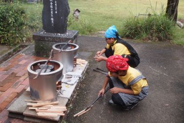 | 炙り焼きソーセージ生地づくり班 | 飯盒炊飯班 |