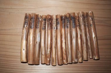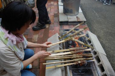 | 竹の串に生地をつけます | 炭火&薪で生地を焼きます。 |
