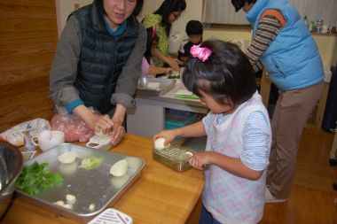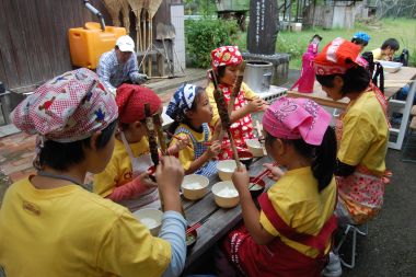 参加者全員で昼食の準備です。男性は、炙り焼きソーセージを焼くための火起こしと釜戸での炊飯を担当し、女性は、炙り焼きソーセージの生地作りを担当しました。炙り焼きソーセージの生地は竹串に巻きつけて、直火炙り焼きしていきます。昼食の準備が整ったのは、12時半過ぎで、お腹が空いた参加者は、釜戸で炊いたご飯と炙り焼きソーセージで昼食をたっぷりと美味しくいただきました。
