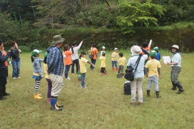 家族毎に4班に分かれて、「川の宝物探し」「ささ舟どおり」「川の音を聞く」「アメンボの旅」を行ないました。「川の宝探し」は、カードに描かれたキラキラ光るの物・川の天使(川虫)・テナガエビ他を探していきます。「ささ舟どおり」は、笹で作った舟をゲートに向けて川上から流します。「川の音を聞く」は、ホースで川の水の流れの音を聞きます。「アメンボの旅」は、両手両足を広げ川の流れに身体をまかせます。いずれも川にたのしく親しむためです。川を好きになり、川を大事に思う気持ちを育みます。
