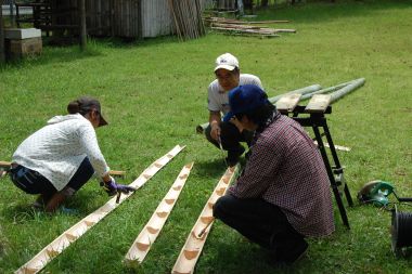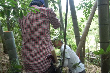 素麺を流す竹レールを作りために、まずは孟宗竹を2本伐採して、手ごろな太さの部分を切り出して、二割りにしてレールにしました。素麺を流して試食をすることで昼食代わりとしました。