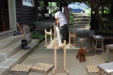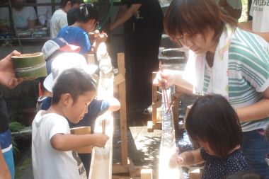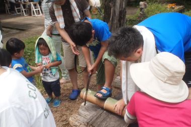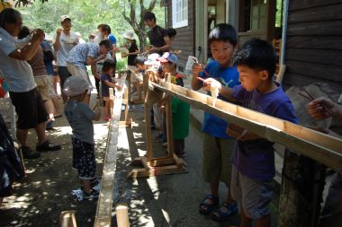 ネイチャーゲームと川あそびの後、着替えが終わり、子供たちは竹でそうめんお椀を作りました。そうめん流し用竹レールには太すぎる竹をお椀用にと残しておきました。子供たちが、のこぎりで切るには太すぎる竹でしたが、がんばって自分のお椀を作っていきました。