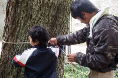 森の学舎グランドにあるサクラ、センダン、イヌマキ、ヤマグワの4種類の樹木の高さと幹の外周を測り、その木がどの位の二酸化炭素を吸収するのかを計算します。計算結果から、私たち人間の暮らしで排出する二酸化炭素を吸収するために樹木が何本必要かを考えます。