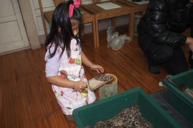 下層に水はけのための軽石を敷いて、上層に腐葉土を入れ、ドングリを3個づつ土の中に埋めていきます。今回使用したドングリは、クヌギ・マテバシイ・ナラカシワ・の4種類です。各自好きなドングリの竹ポットをつくりました。春に芽がでたら2年後に山に戻します。